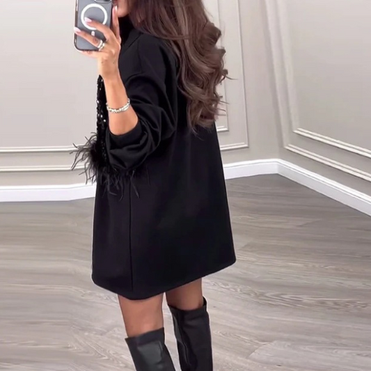 Elegantiška išskirtinė suknelė su žėrinčiomis detalėmis ir plunksnomis